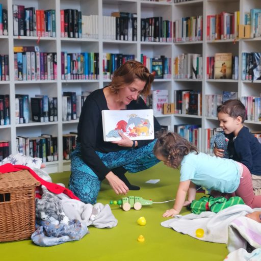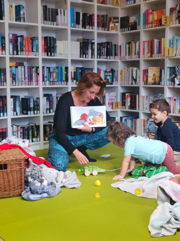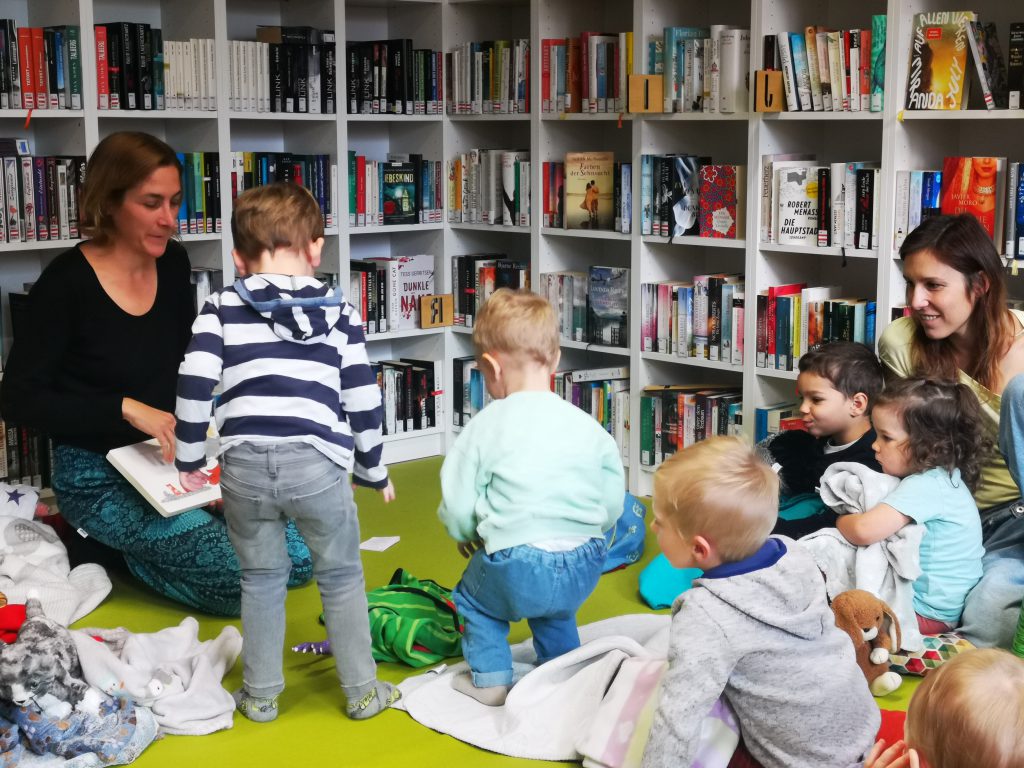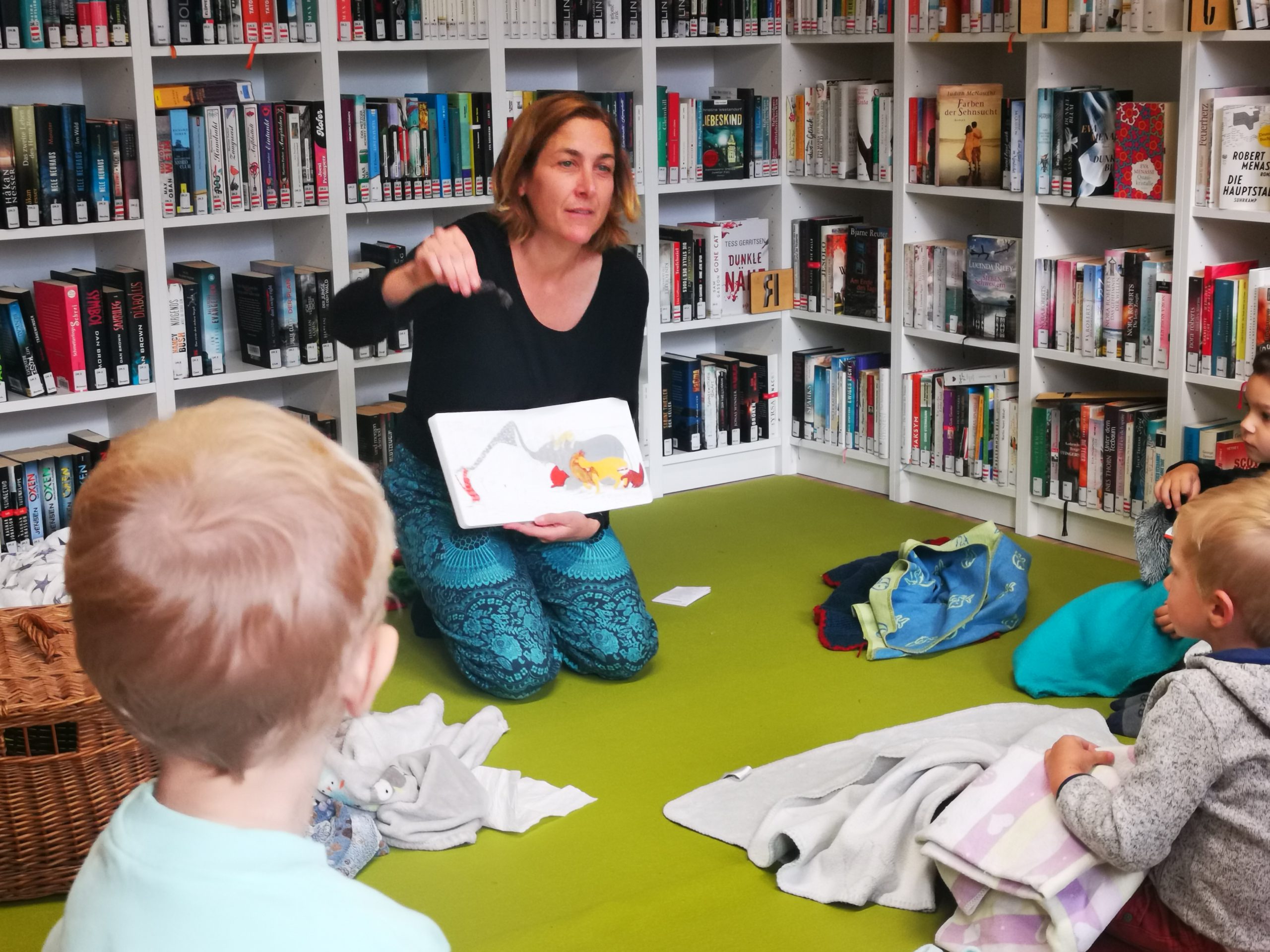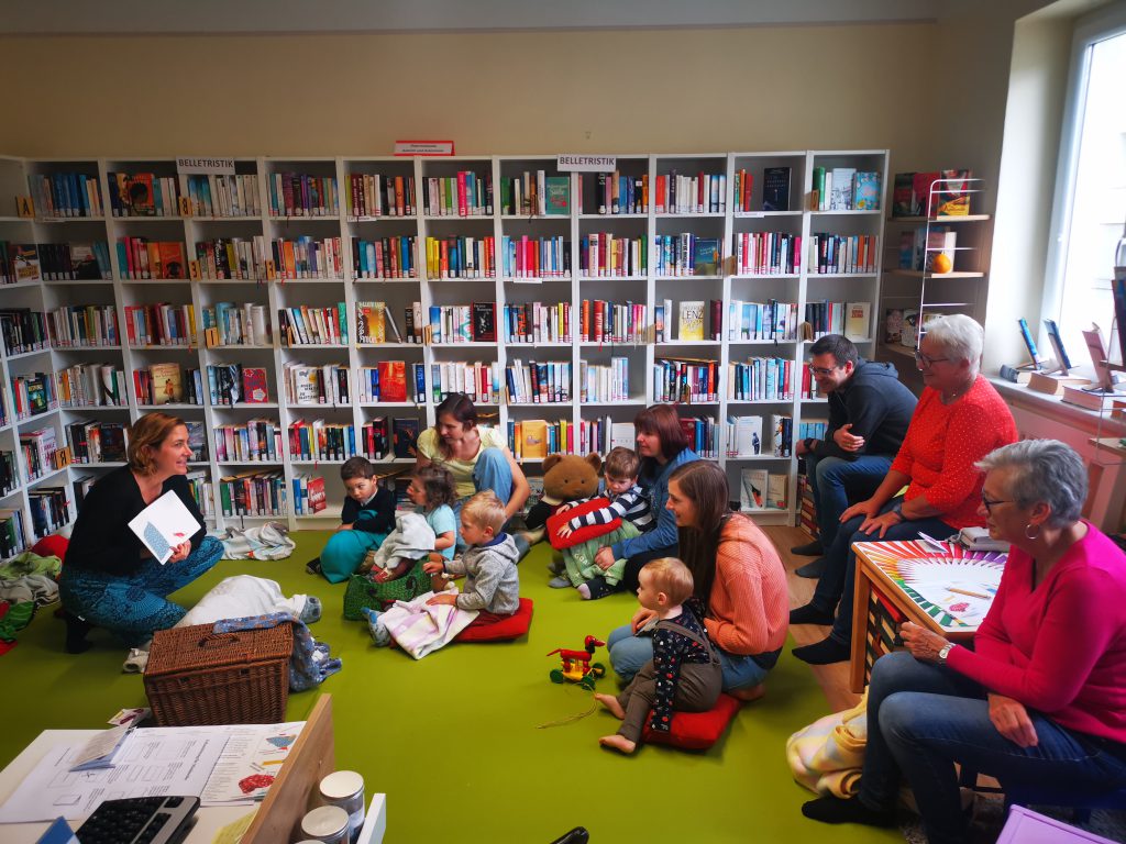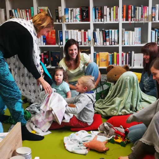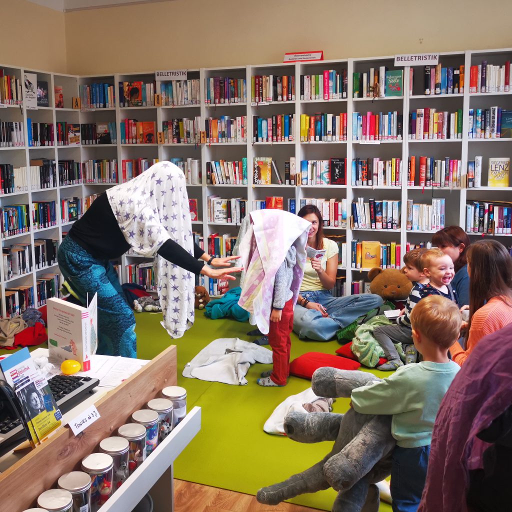Ganz offensichtlich viel Spaß hatten die jüngsten Sulzerinnen und Sulzer – bis drei Jahre nennen wir sie ‚Bücherwürmchen‘ – mit den vielen Spielen und Reimen, die Stefanie Sandhäugl in die Bibliothek mitgebracht hatte. Die Kunstpädagogin und Literaturvermittlerin hatte das Bilderbuch „Unter Decken verstecken“ von Andrea Peter dabei, das ganz viele lustige Ideen für Familien bietet.